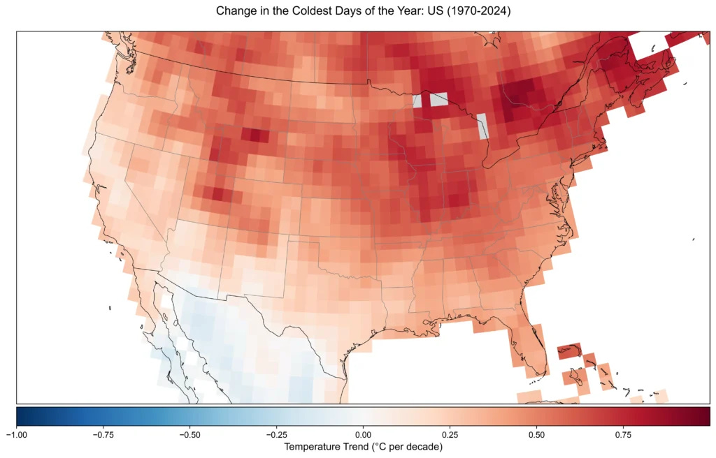 Almost no regions of the US have seen a cooling trend in the 5% coldest days of the year – and higher latitude regions have tended to experience the fastest winter warming.