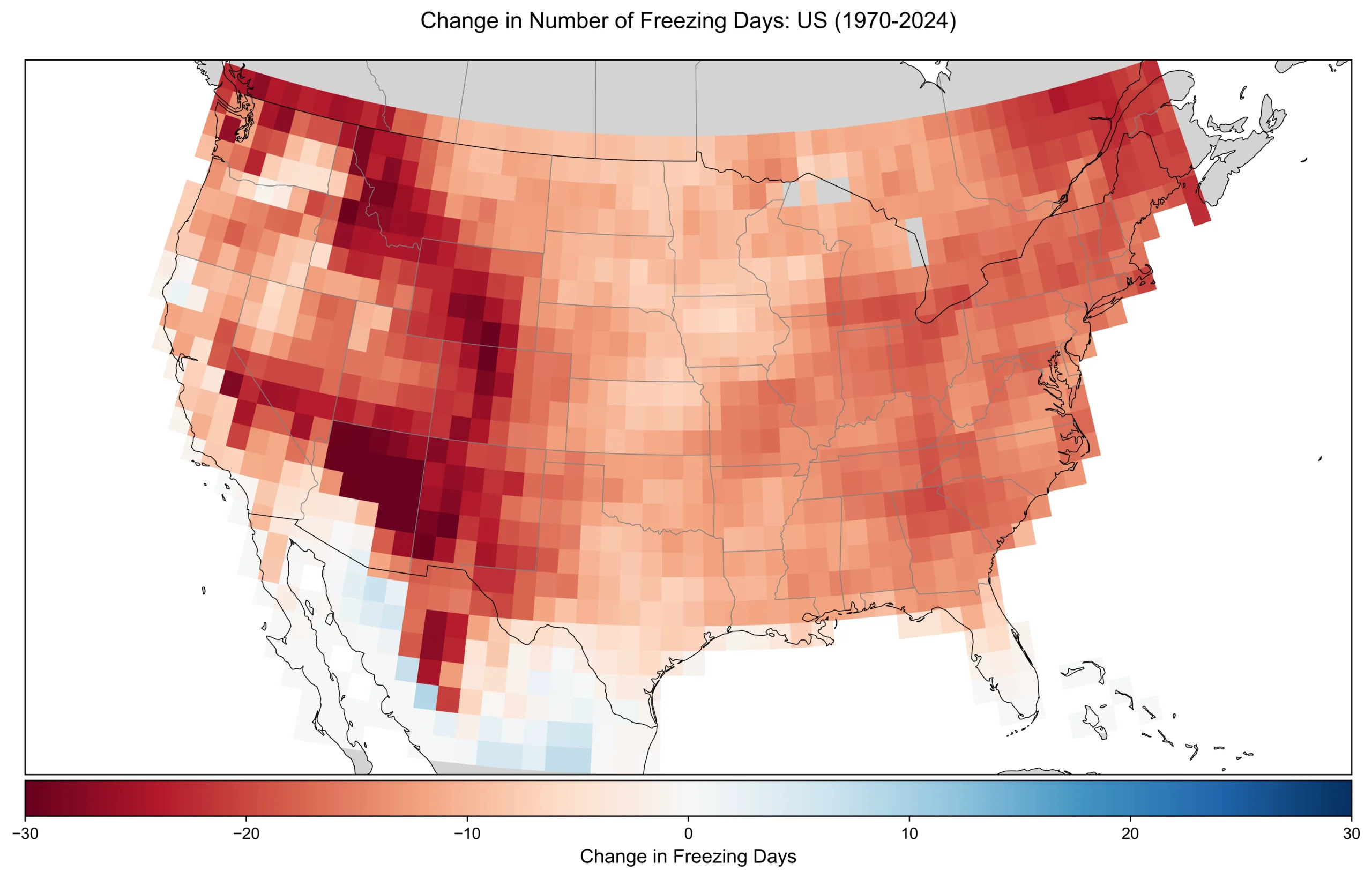 Another way to assess changes in cold events is to look at the change in the number of days where any hour of the day – that is, the daily minimum temperature – is below freezing (0C, 32F). The map below shows the change in average annual freezing days between 1970 and 2024.