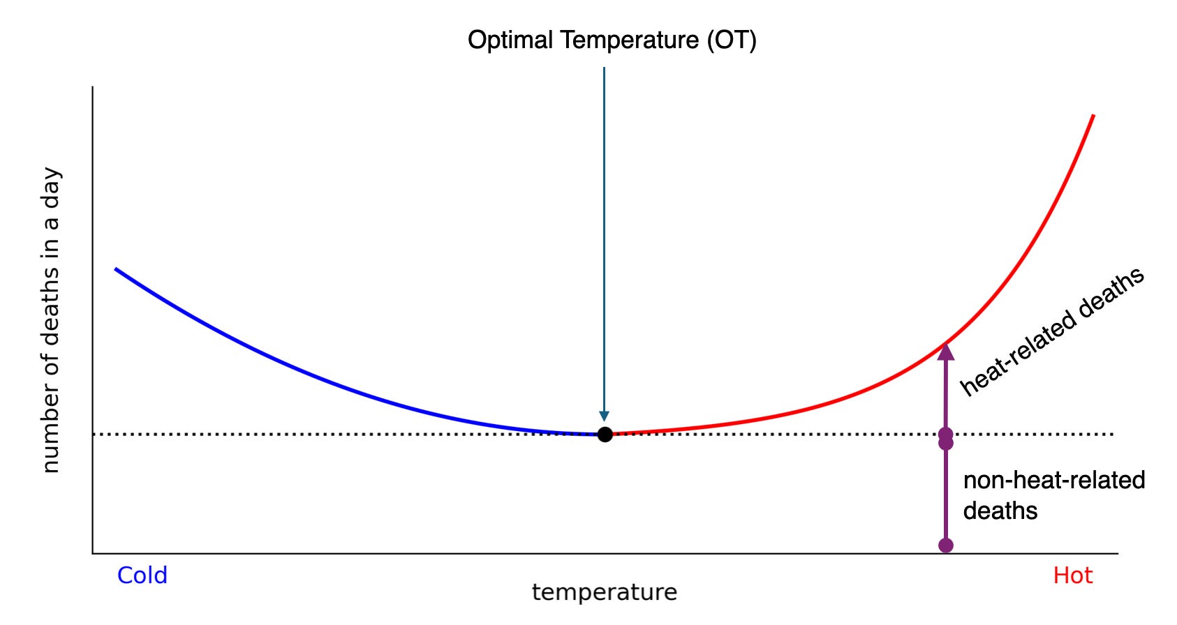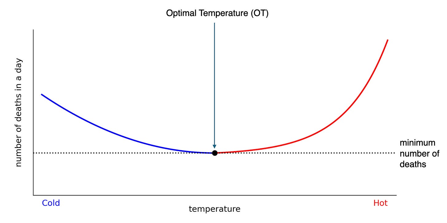 The relationship between daily average temperature and daily mortality is a U-shaped curve. The temperature at which the minimum number of deaths occur, often called the optimal temperature (abbreviated OT)1, is around 20°C (70°F) in most places. Mortality goes up as the temperature departs from the OT towards either hotter or colder temperatures.