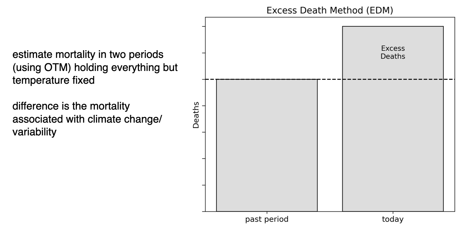 For that, we use what we refer to as the Excess Death Method (EDM). Our approach is to take today’s mortality risk curve (based on today’s population, today’s demographics, today’s level of adaptation to heat), but plug in the temperatures from a past period — in our analysis, we used 1950-1963.