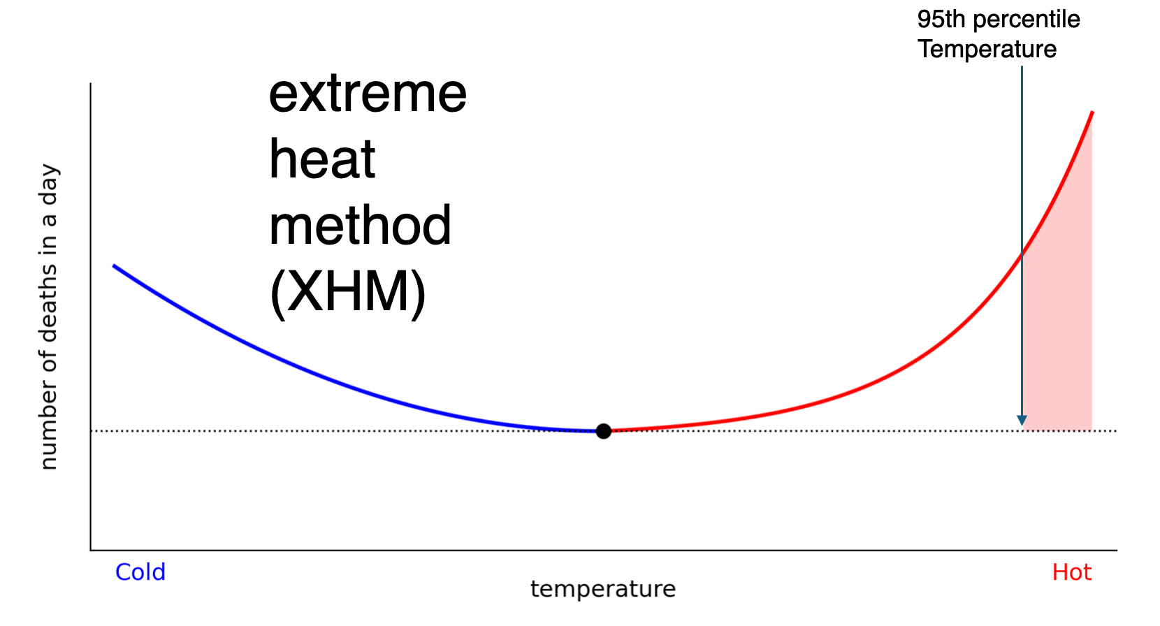 A more intuitive approach is to sum heat-related mortality occurring on days that are extremely hot — say, days above the 95th percentile daily average temperature threshold (the red shaded area in the plot below). This is a more direct metric for what the warmest temperatures are doing.
