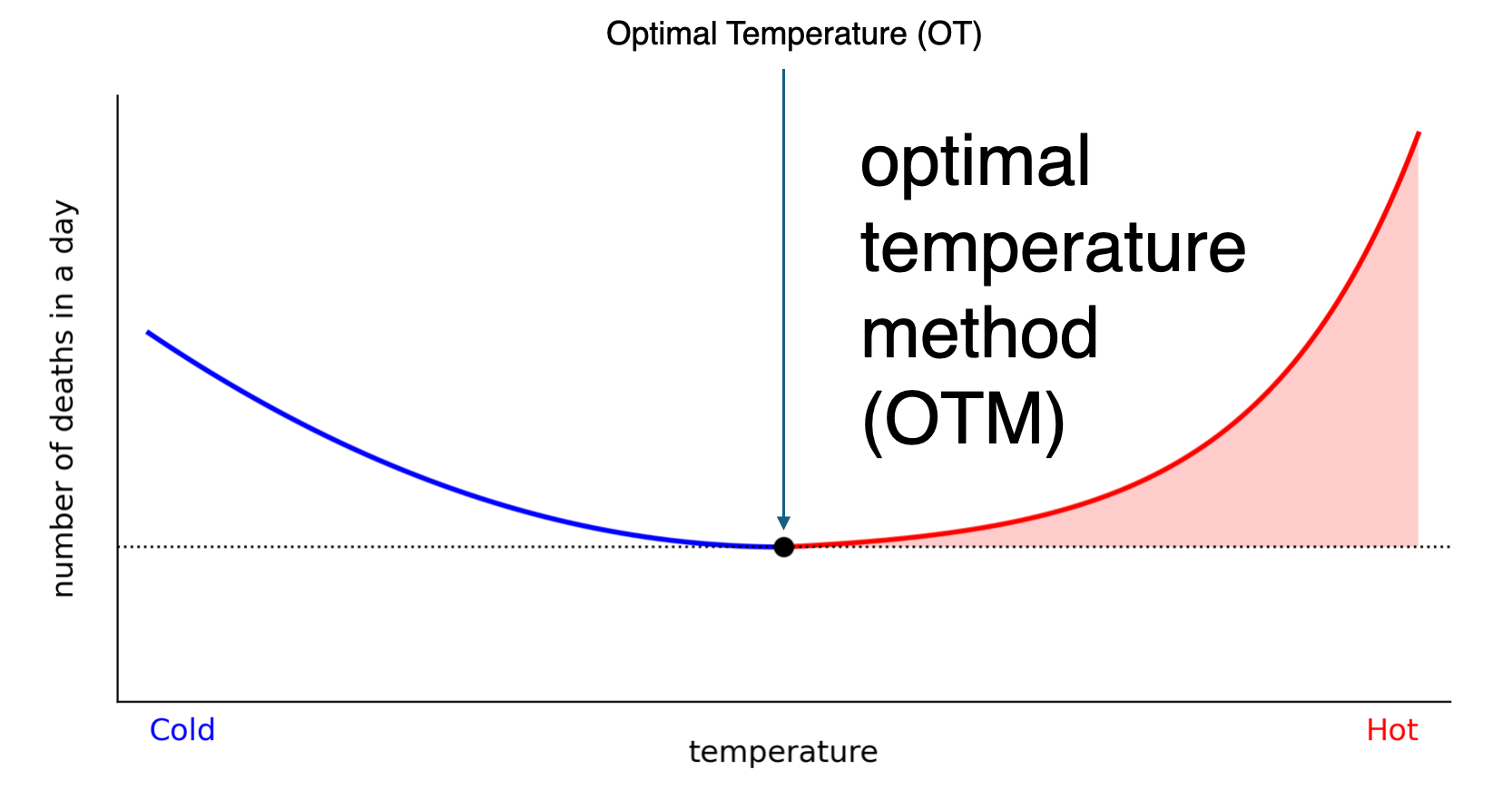 By convention, the number of deaths occurring at the OT provides an estimate of the baseline (non-heat-related) deaths. At any other temperature, deaths above this baseline are assumed to be heat related.