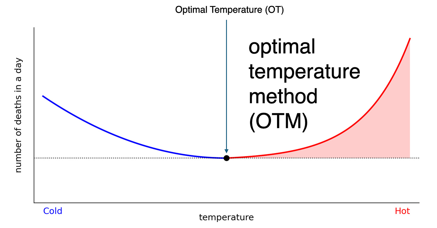 The optimal temperature method counts all deaths above the optimal temperature. It’s the most common method in the literature and produces the largest numbers. It’s not wrong, but you should remember that most of these deaths are occurring at mild temperatures that happen every year, so it’s not measuring the impact of “extreme heat” in any intuitive sense2.