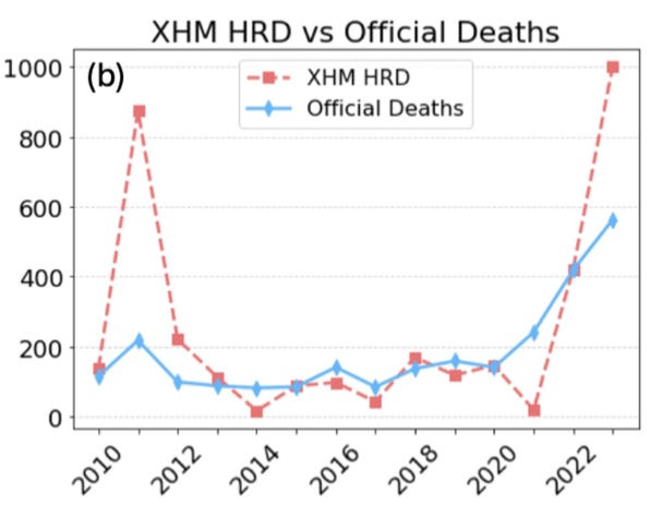 When we compare these numbers to the official death certificate numbers provided by the Texas Department of State Health Services — which counts cases where a medical examiner determined heat was the cause or a contributor to death — the agreement is good, at least in normal years. In extremely hot years like 2011 or 2023, the official death numbers appear to significantly undercount the true number.