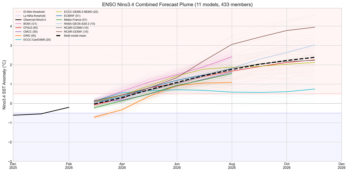 Note that this shows the old ONI 3.4 Index rather than the new RONI one that better separates out recent global warming from the ENSO signal and has the 2023/2024 El Nino notably smaller. This is because the forecast models still use the old approach to calculating ENSO 3.4 anomalies.