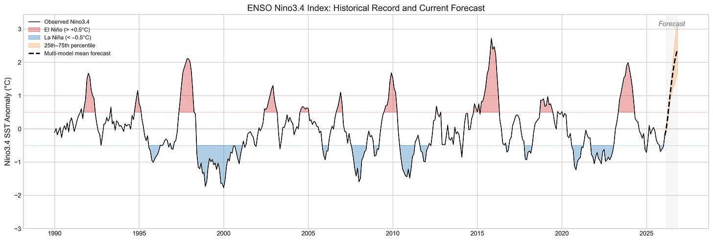 Either way, this means that 2027 looks increasingly likely to set a new record, perhaps by a sizable margin if we end up on the high end of the range of El Niño forecasts.