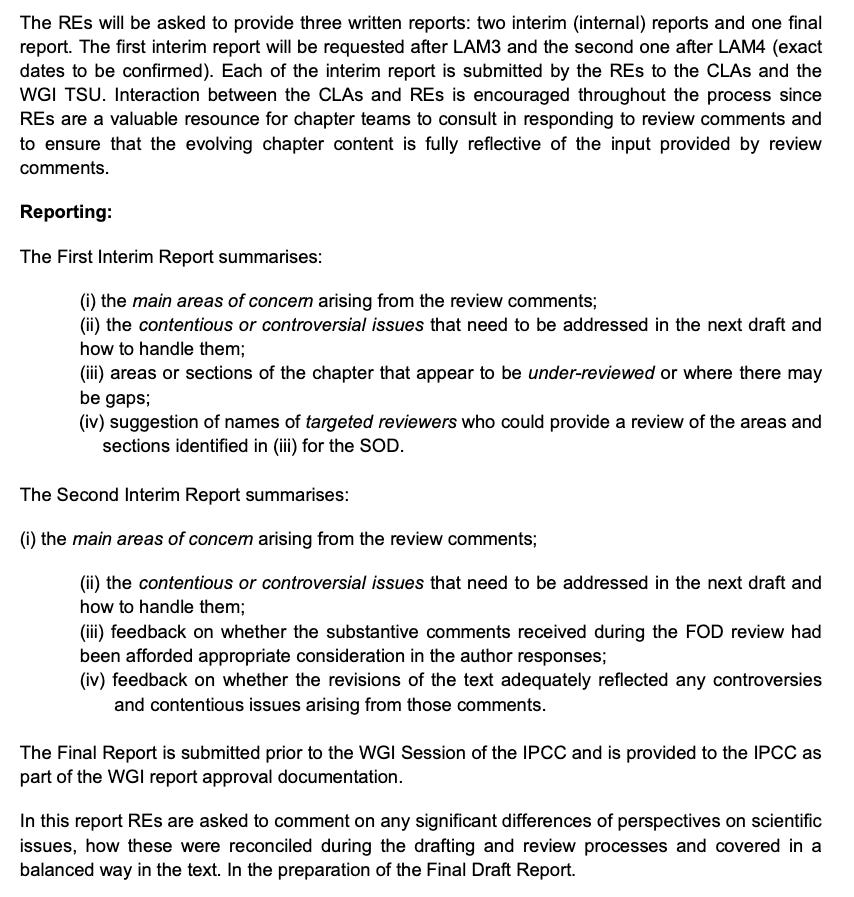 There are comprehensive descriptions of the duties of review editors (REs). Here’s the guidance for REs from the last IPCC report: