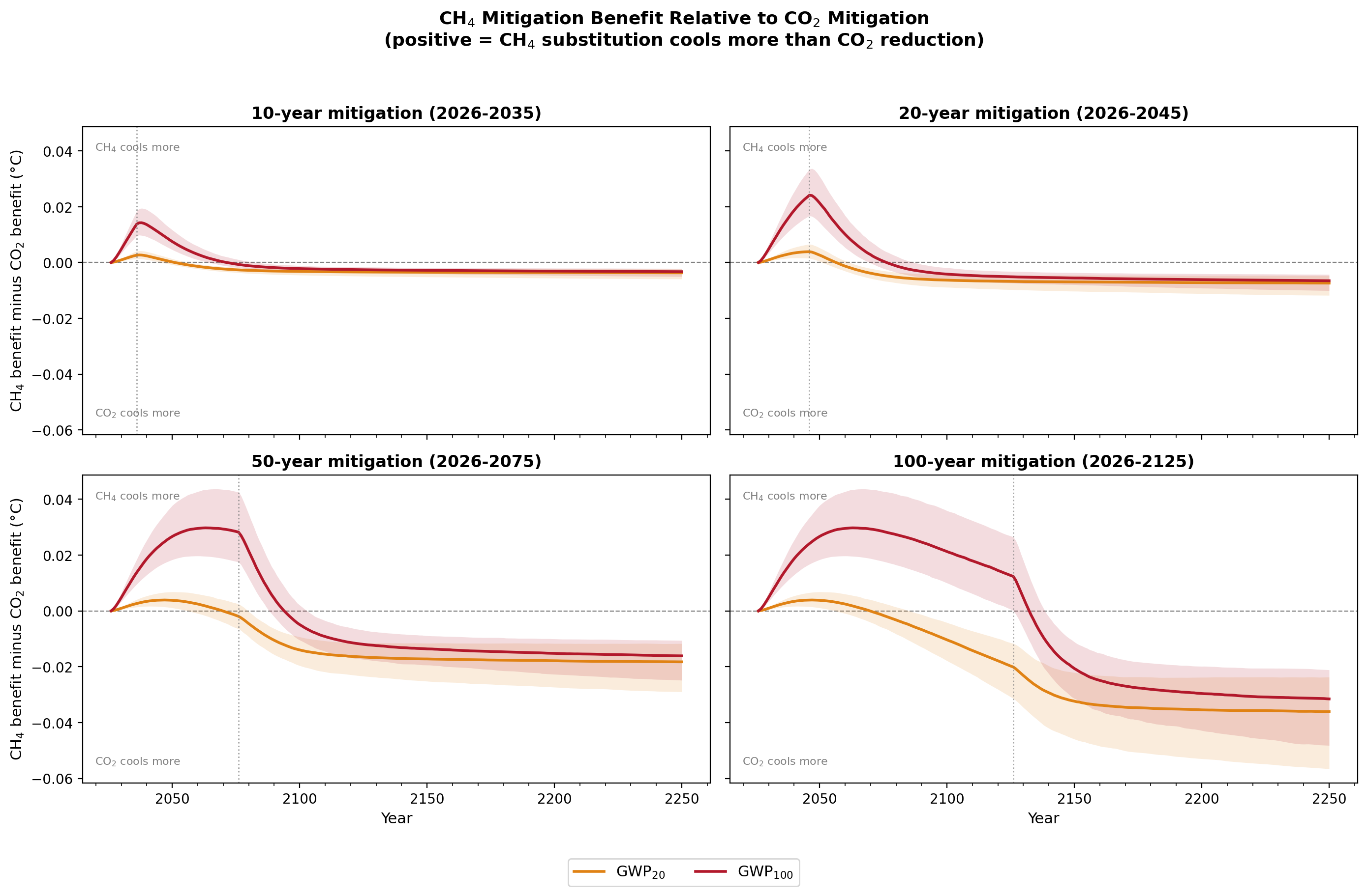 We can also more directly look at the difference in global temperatures over time if we chose to mitigate methane emissions instead of CO2 emissions. In the figure below, values above zero reflect periods when we get more cooling from methane reductions than from CO2, while values below zero show periods where CO2 reductions give us a bigger climate benefit. Here the GWP100 metric provides at least some period of climate benefits, while GWP20 only gives a very short term boost.