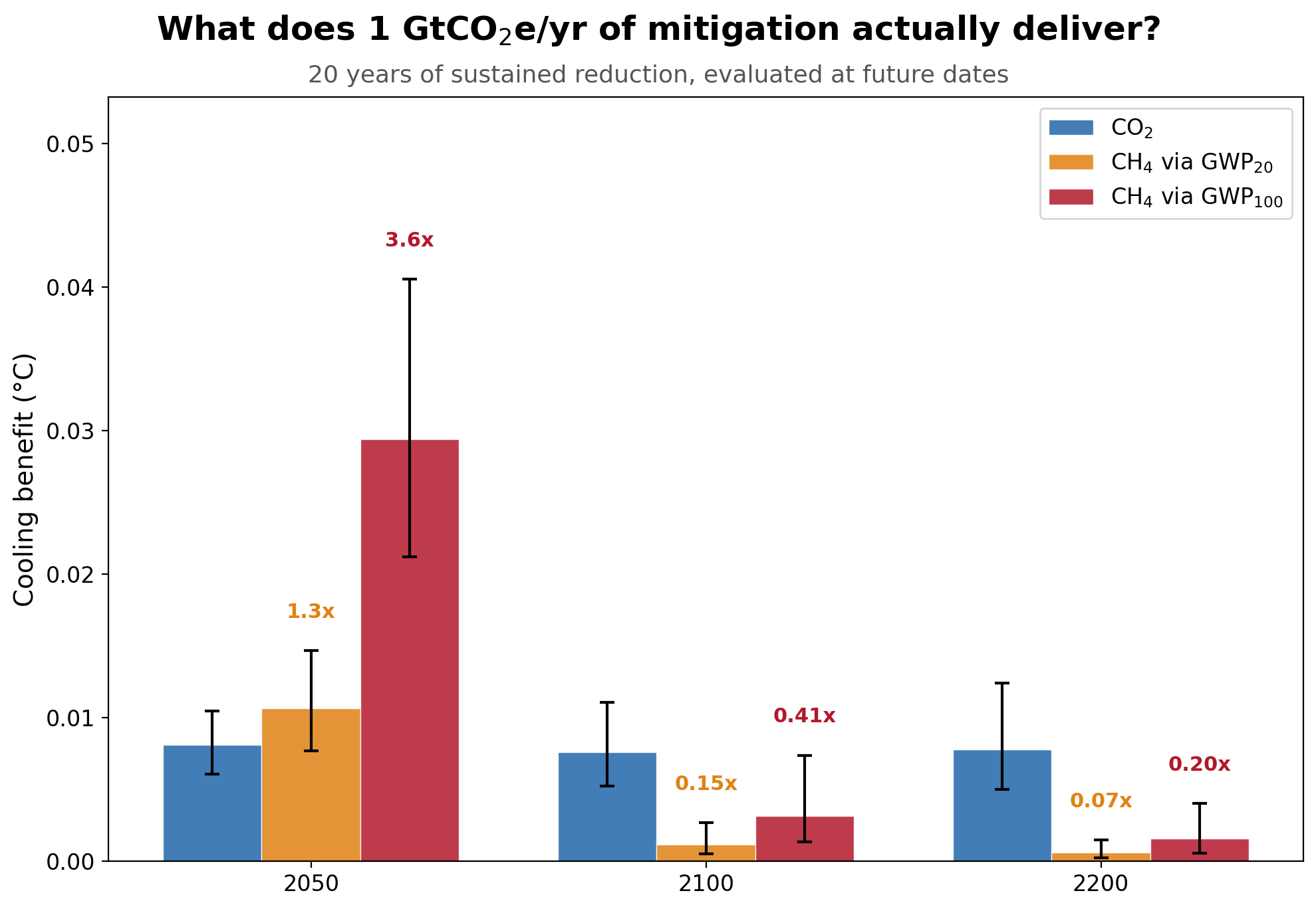 If we use a 20-year GWP period to compare methane and CO2, we get the worst of both worlds. Not only does the cooling benefit of methane mitigation not persist, but it’s not that much greater than CO2 during the period of emissions. This is because we need to cut a lot less methane (only around 12.1 megatons per gigaton of CO2) when using GWP20 compared to a much larger reduction (33.6 megatons) when using GWP100.