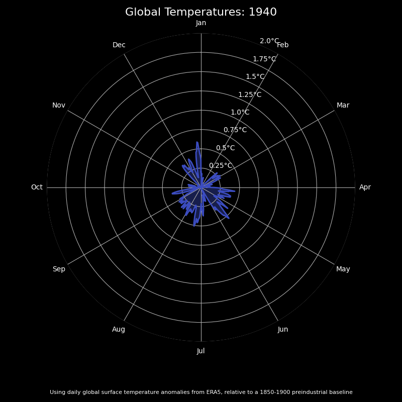 Here are daily global temperatures by year between 1940 (when the ERA5 daily dataset begins) and the end of 2024, with the color varying from blue to red over time.