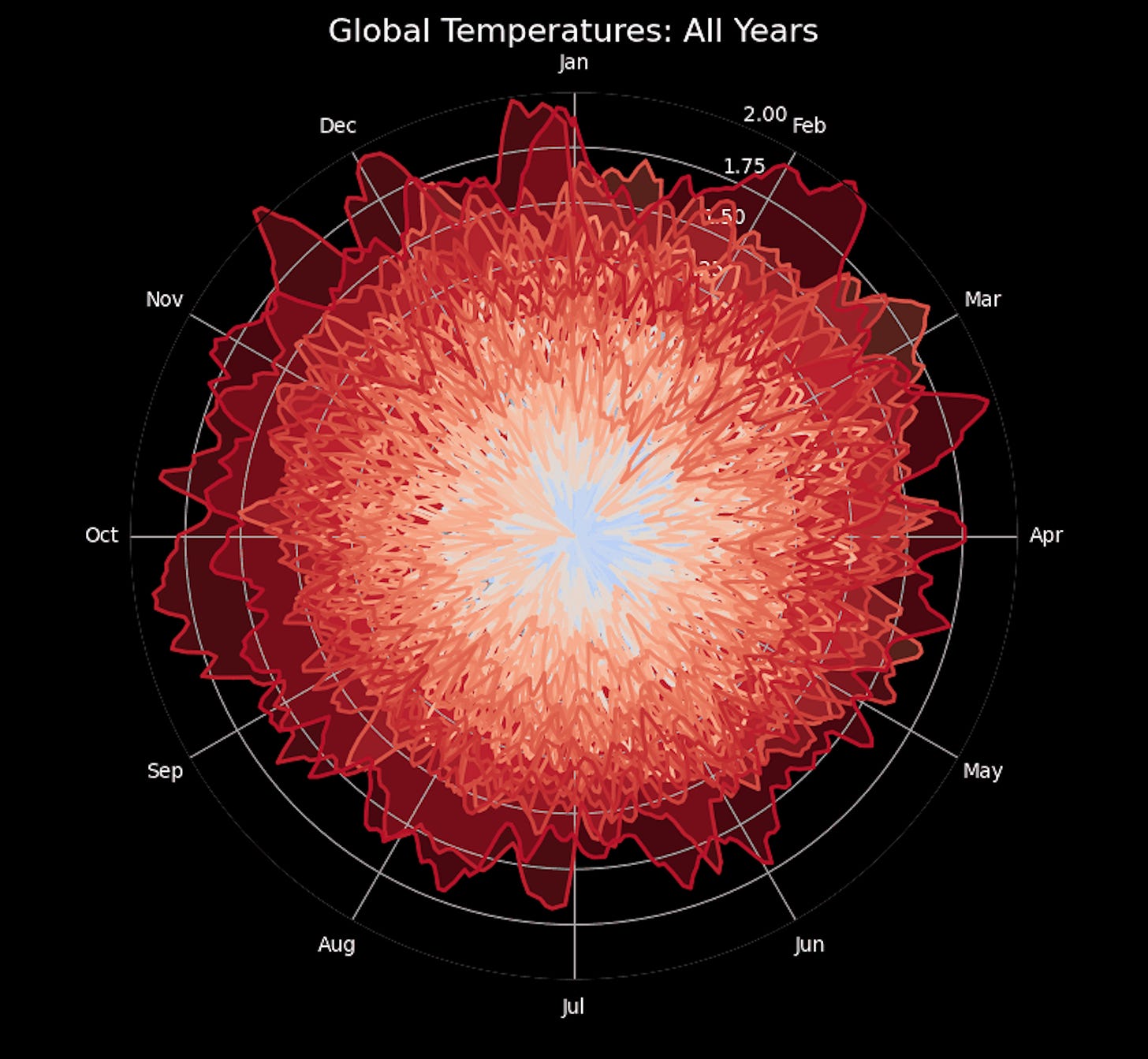 Good data visualizations can help make climate change more visceral and understandable. Back in 2016 Ed Hawkins published a “climate spiral” graph that ended up being pretty iconic – it was shown at the opening ceremony of the Olympics that year – and is probably the second most widely seen climate graph after Hawkins’ later climate stripes.
